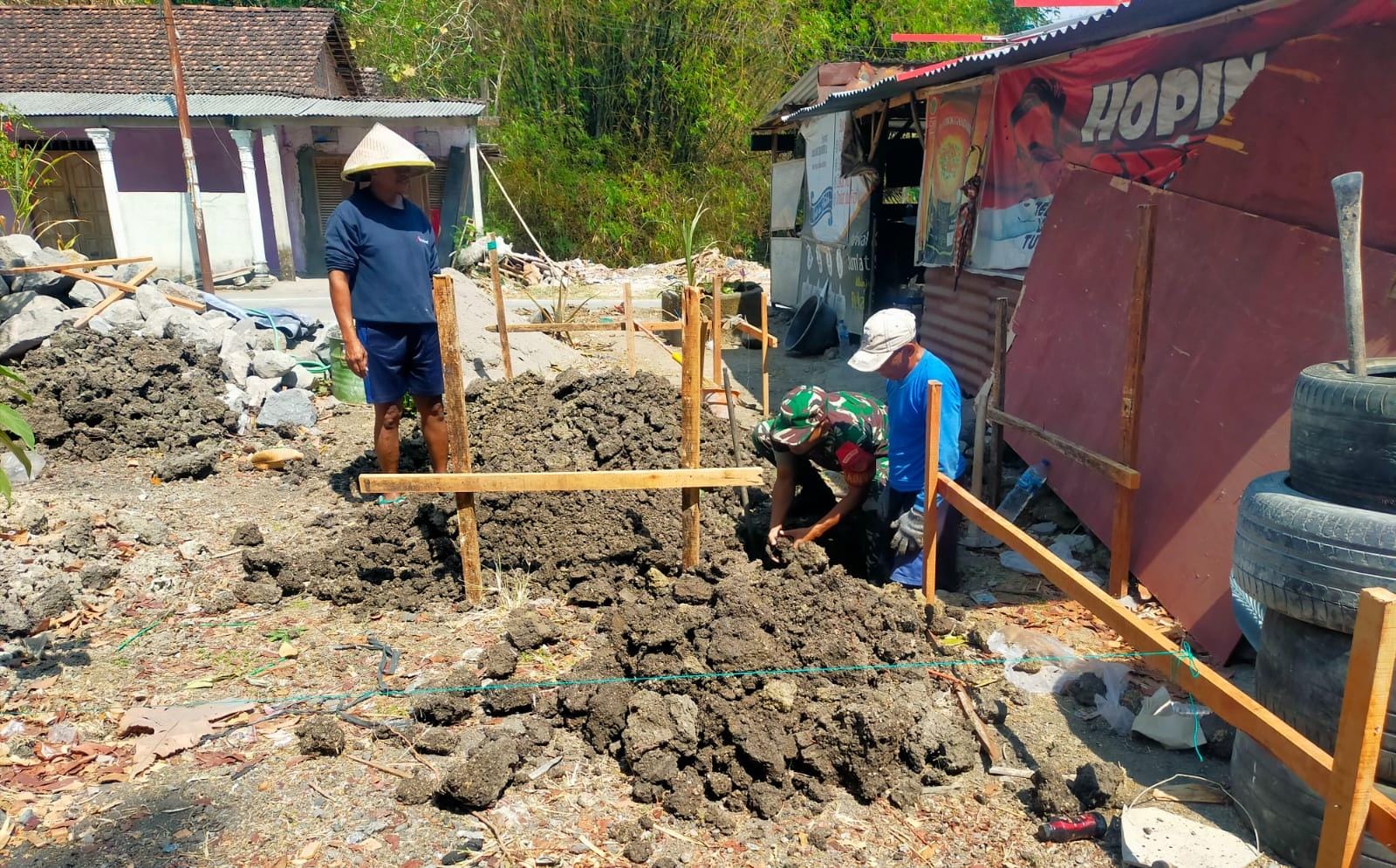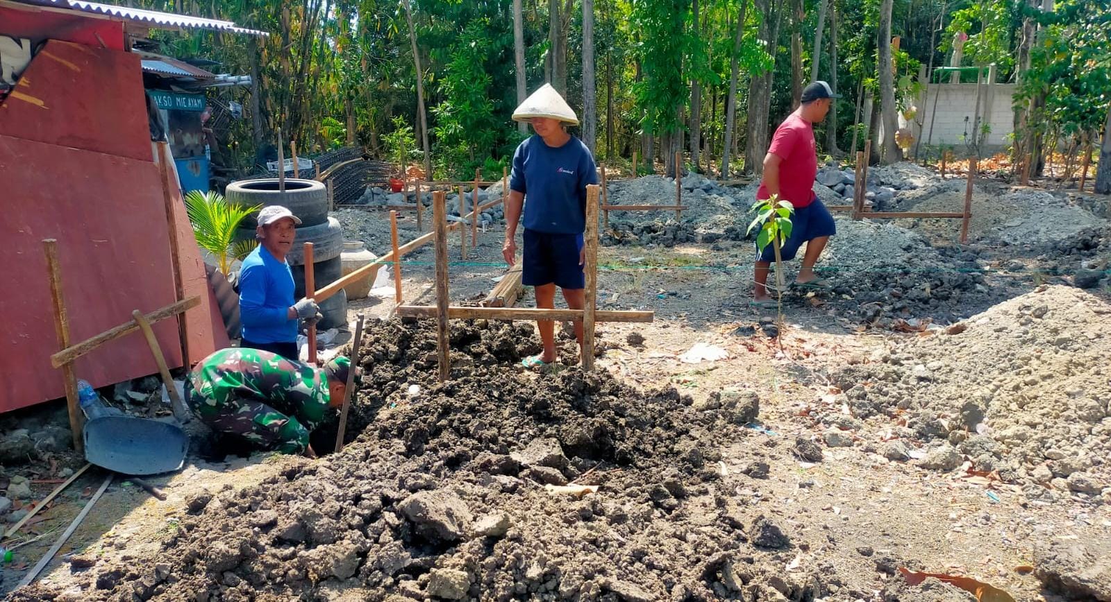 Demi terwujudnya tempat tinggal yang nyaman, Serma Jumarno Babinsa Desa Ngebung Koramil 18/Kalijambe Kodim 0725/Sragen melaksanakan karya bakti pembuatan pondasi rumah bersama warga Dukuh Padas, Desa Ngebung, Kecamatan Kalijambe, pada Rabu (4/10/2023).